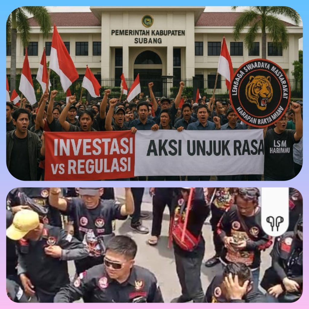 Ribuan massa dari Lembaga Swadaya Masyarakat Harapan Indonesia Maju (HARIMAU) Kabupaten Subang menggelar aksi damai di depan Kantor Pemkab Subang. Aksi ini dilakukan untuk menyampaikan aspirasi terkait persoalan investasi dan ketenagakerjaan di wilayah Kabupaten Subang.