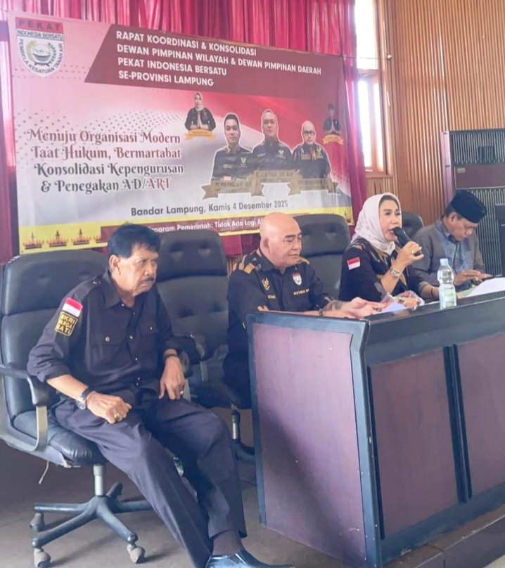 Etik News. Bandar Lampung — Ketua DPW Pembela Kesatuan Tanah Air Indonesia Bersatu (Pekat IB) Provinsi Lampung, Novianti SH., CH., memimpin kegiatan Konsolidasi dan Koordinasi bersama jajaran pengurus DPD Pekat IB se-Provinsi Lampung pada Kamis, 4 Desember 2025, bertempat di Sekretariat DPW Pekat IB Teluk Betung, Bandar Lampung.