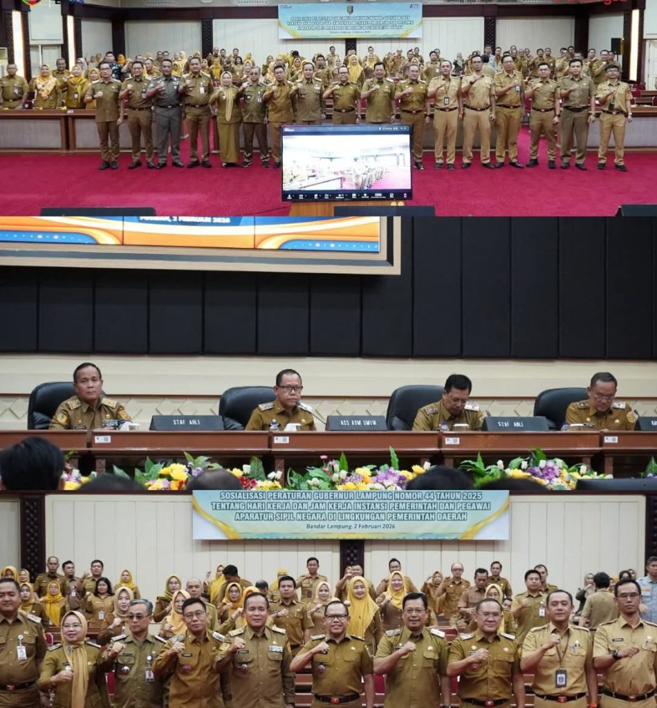 Etik News, Bandar Lampung — Pemerintah Provinsi Lampung menggelar sosialisasi Peraturan Gubernur (Pergub) Nomor 44 Tahun 2025 tentang hari kerja dan jam kerja instansi pemerintah serta Aparatur Sipil Negara (ASN) di lingkungan pemerintah daerah. Kegiatan ini dibuka oleh Gubernur Lampung yang diwakili Asisten Administrasi Umum, Sulpakar, di Gedung Pusiban, Senin (2 Februari 2026).