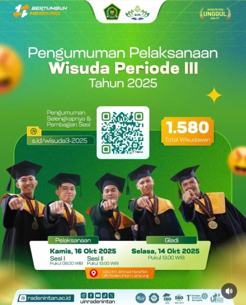Wisuda Periode III ini menjadi bukti komitmen UIN Raden Intan Lampung dalam mencetak generasi unggul, religius, dan berdaya saing di tingkat nasional maupun global. (Red)